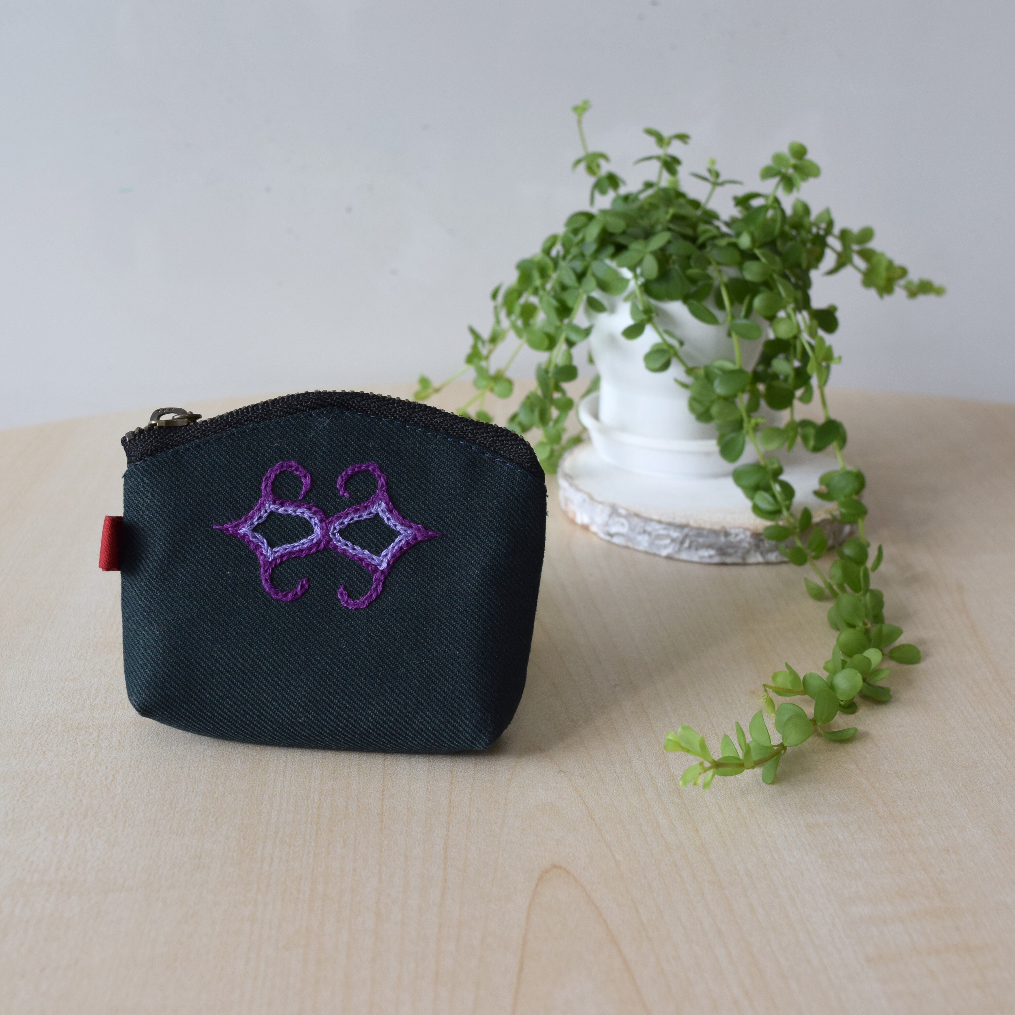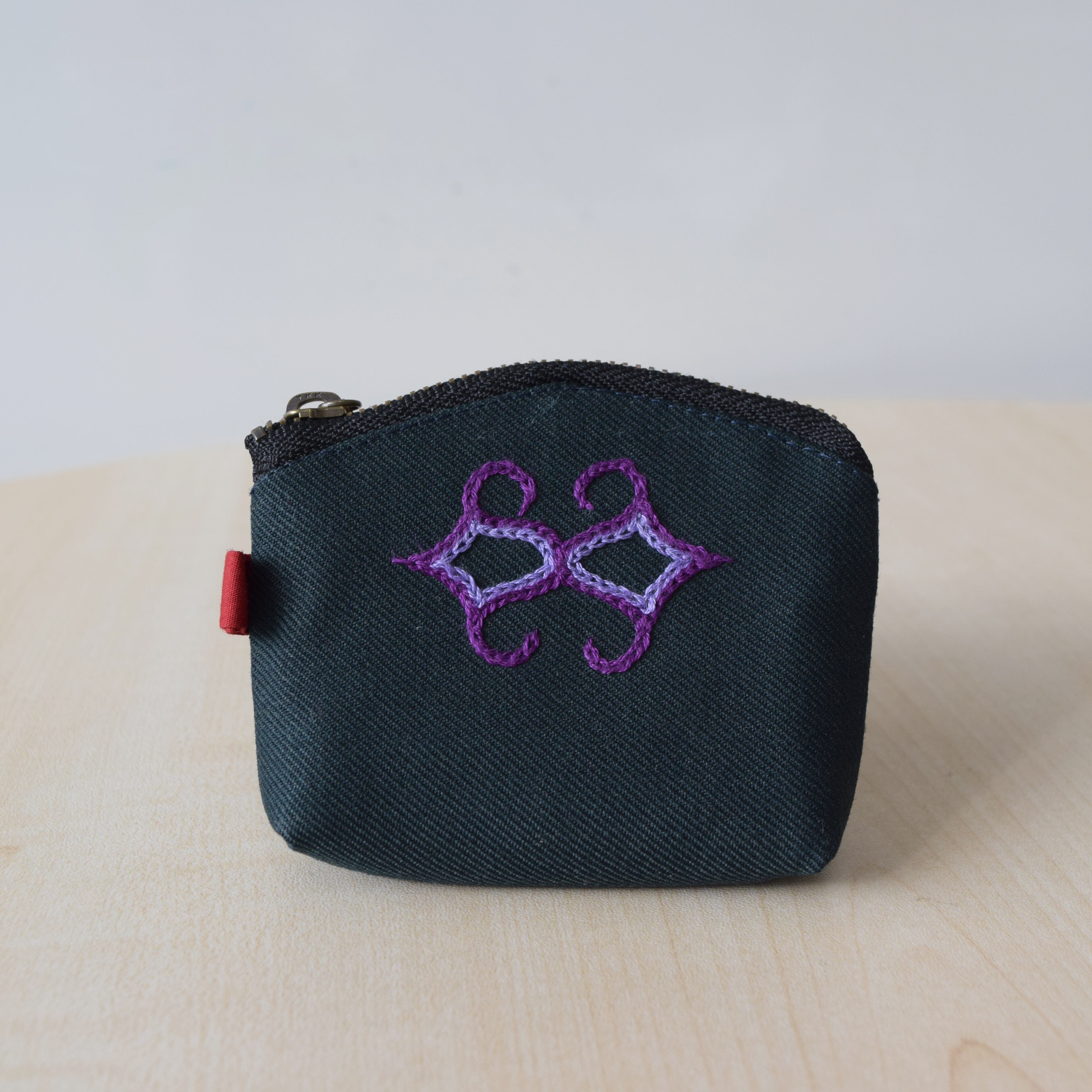 ●作品紹介:公益社団法人北海道アイヌ協会の優秀工芸師として認定されている女性作家による、深緑の生地に紫色を基本としたワンポイントの刺繍を施した小銭入れ。片手に収まり使いやすいサイズです。