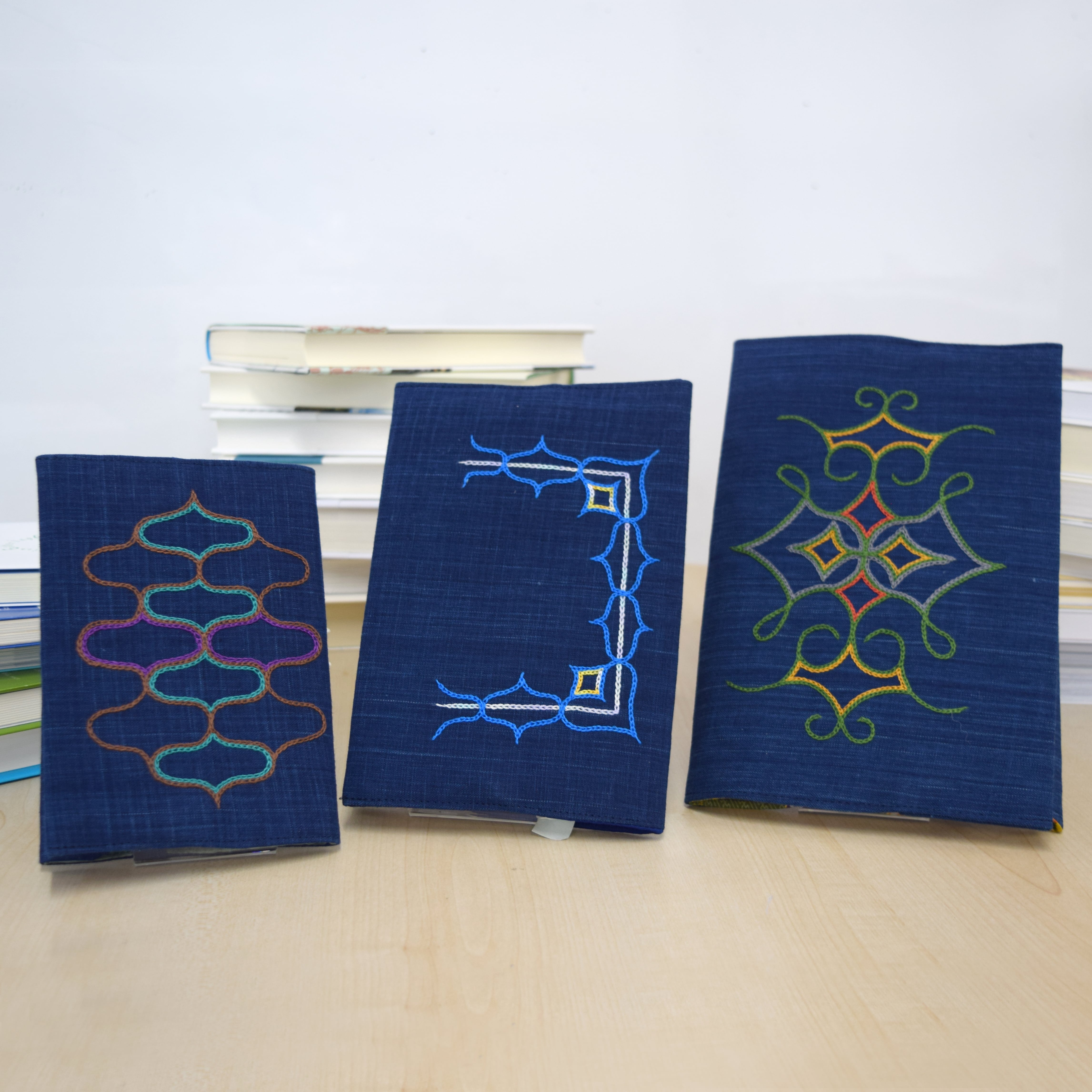 ●作品紹介:公益社団法人北海道アイヌ協会の優秀工芸師として認定されている女性作家による、紺色の生地に茶色を基本として、紫や水色の刺繍を施したブックカバー。内側は柄物の生地を使用し、外側と内側の表情の違いをお楽しみいただけます。文庫がちょうど収まるサイズです。